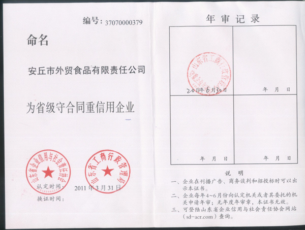 • 公司被评为山东省守合同重信用企业