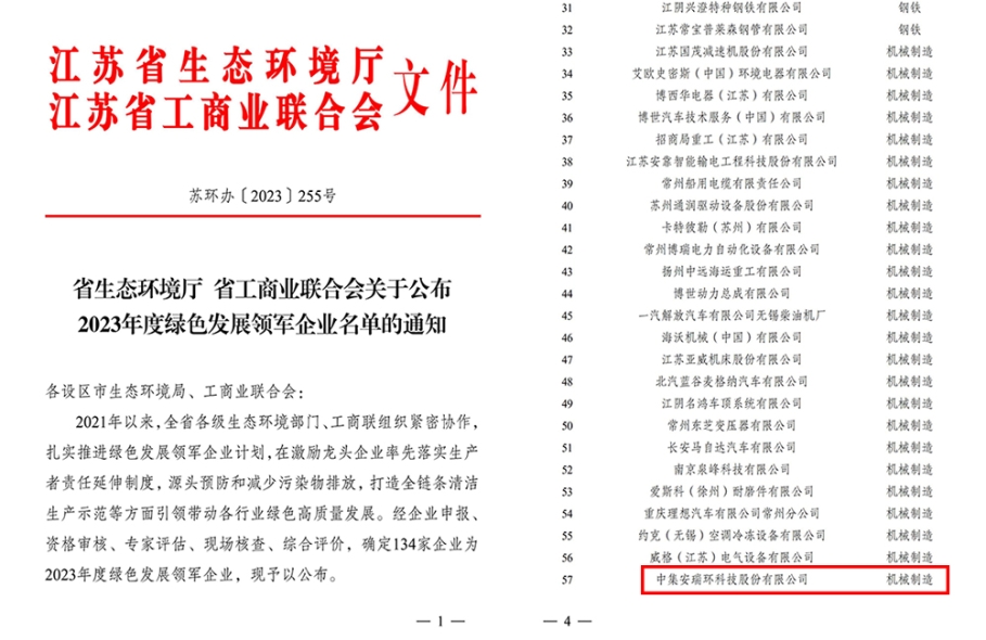 近期,江蘇省生態(tài)環(huán)境廳與江蘇省工商業(yè)聯(lián)合會(huì)聯(lián)合發(fā)布“2023年度綠色發(fā)展領(lǐng)軍企業(yè)”名單,中集安瑞環(huán)科技股份有限公司上榜。