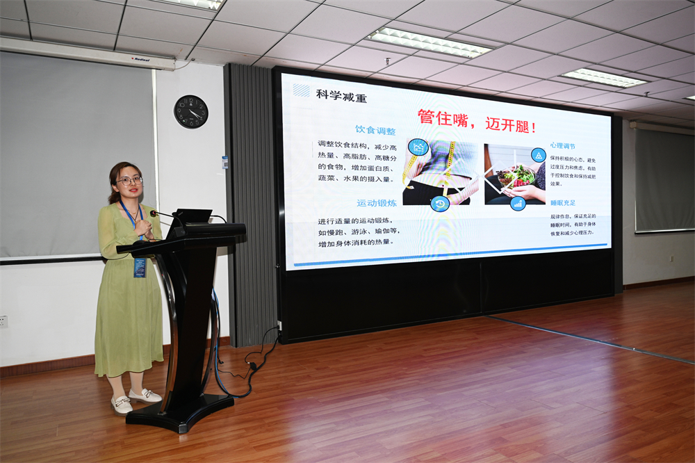 本次活動通大附院特別選派多位權(quán)威專家現(xiàn)場授課、開展義診。南通大學附屬醫(yī)院黨委委員、副院長魯菊英詳細介紹了通大附院醫(yī)療資源優(yōu)勢及特色健康服務(wù)。作為全市醫(yī)療領(lǐng)域標桿,通大附院為創(chuàng)新區(qū)及周邊居民提供了更加高效、便捷的醫(yī)療服務(wù)保障。南通大學附屬醫(yī)院健康與疾病管理中心的炊娟霞副主任醫(yī)師帶來了《關(guān)注肥胖癥,為健康 “減負”》的專題講座。她深入剖析了肥胖癥的形成原因、對身體健康的危害,以及如何通過科學的飲食和生活方式進行預(yù)防和改善。她用通俗易懂的語言和生動形象的案例,讓員工們深刻認識到肥胖癥對健康的潛在威脅,同時也為大家提供了實用的健康管理建議。?